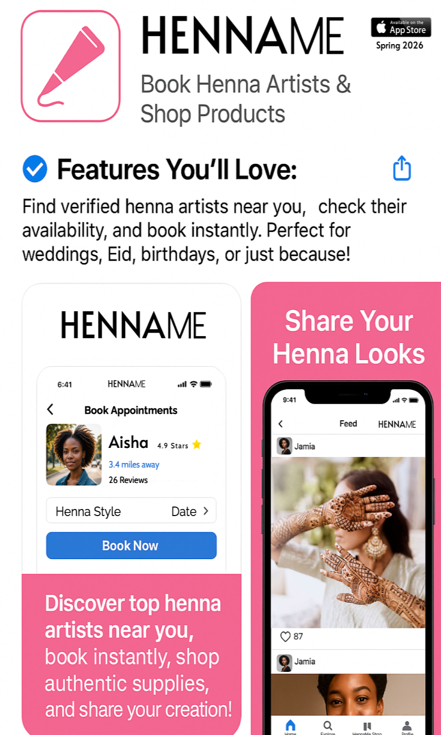 HennaMe is a revolutionary platform created for henna artists and enthusiasts. Featuring new and exciting designs and showcasing a broad array of talent. Empowering communities through one of of the oldest body art forms. Your go to for henna supplies, appointment bookings, tutorials, with a twist of fun, find it all on HennaMe!